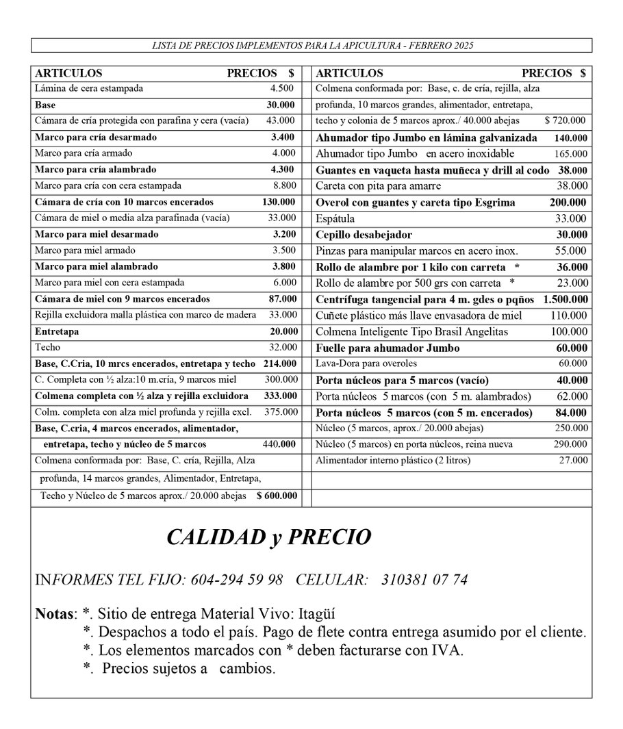 TECNIABEJAS ofrece implementos para el desarrollo de la actividad apícola, a continuación hacemos una descripción de nuestros productos y precios.